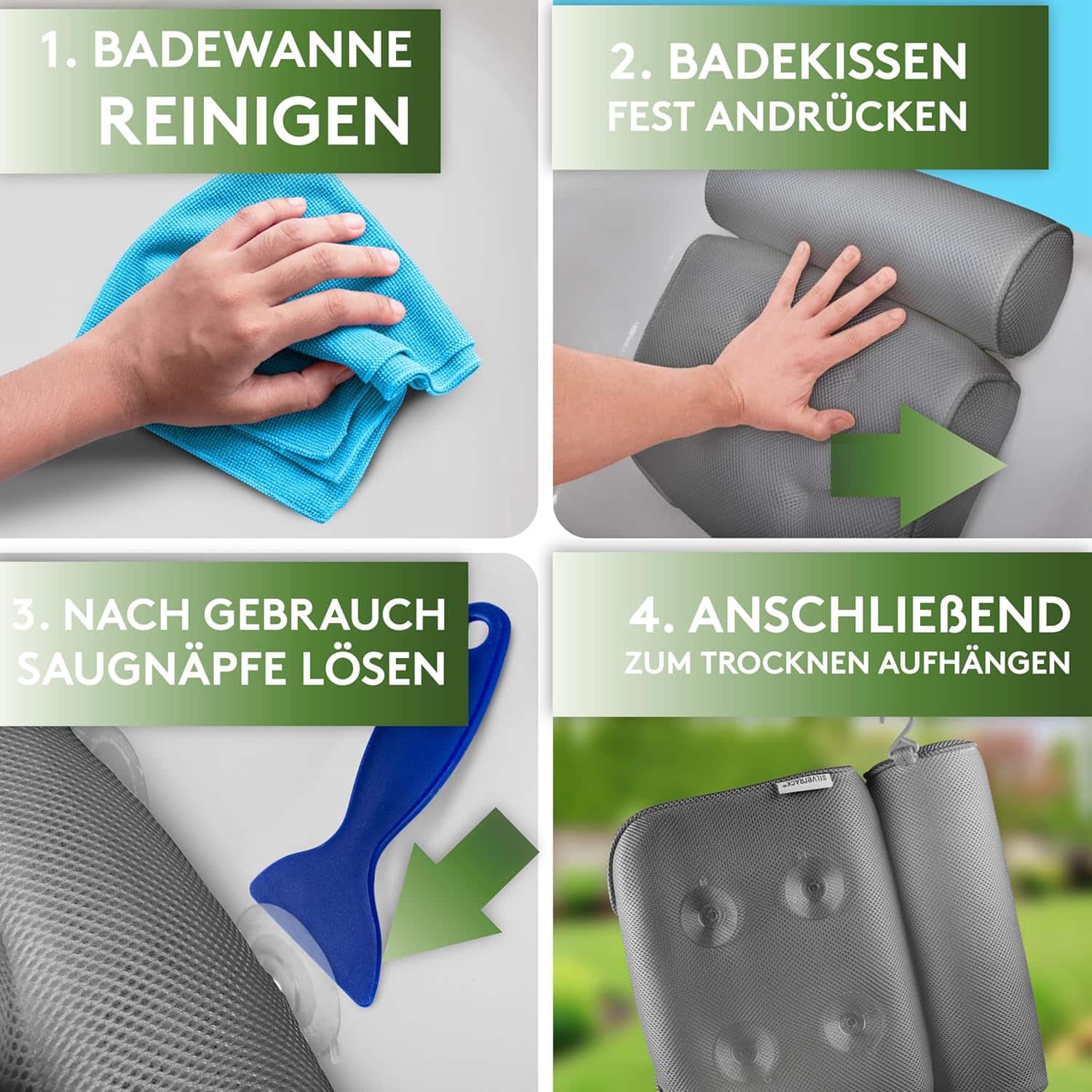 Die neue Saugnapf-Technologie sorgt dafür, dass das Kissen zuverlässig am Wannenrand hält. Es bleibt rutschfest an Ort und Stelle und ist zudem ein stilvolles Badeaccessoire.