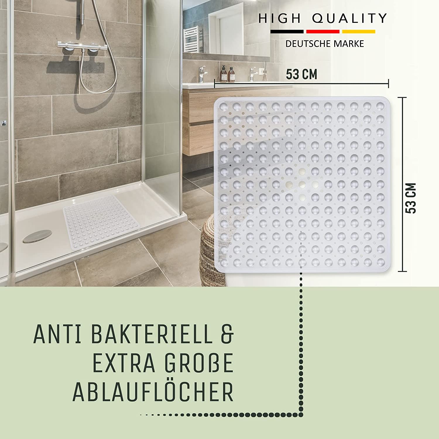 PEFEKTE PASSFORM – Die rutschfeste Wanneneinlage transparent passt sich dem Siphon perfekt an und ist mit seiner Größe von 53x53cm besonders groß: Nur so wird maximale Sicherheit in der ganzen Dusche durch die Rutschmatte gewährleistet!