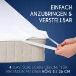 KINDERLEICHTE BEFESTIGUNG AUF IHREM BETT – Dank den breiten und stabilen Gummibändern an den 4 Ecken der wasserdichten Bettunterlage lässt sie sich im Handumdrehen auf 180 x 200 cm großen Matratze mit einer maximalen Steghöhe von 28cm anbringen: Wirkungsvoller Matratzenschutz zum kleinen Preis