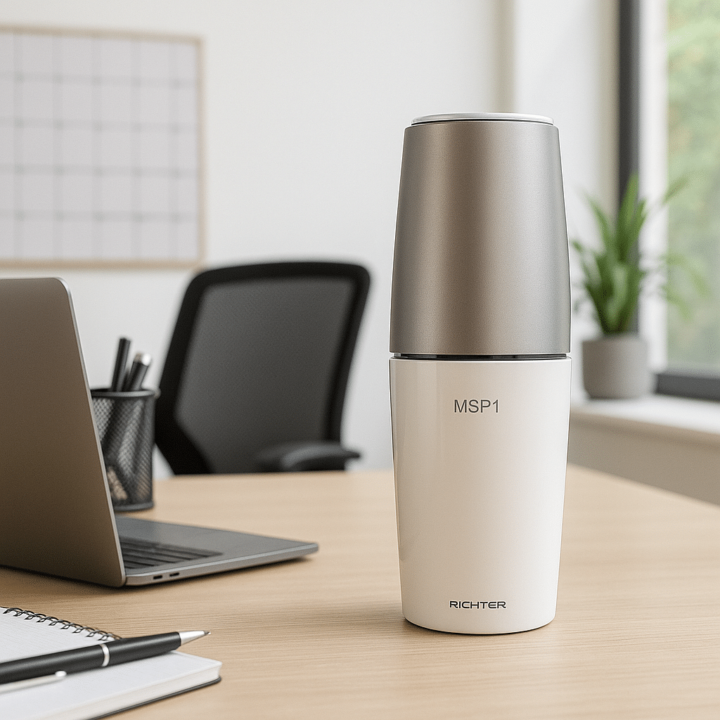 RICHTER MSP1 – tragbarer UV-C Luftreiniger (253,7 nm) mit USB-Anschluss: Kompakter Luftsterilisator für Schreibtisch & unterwegs. Der integrierte Titandioxid-Photokatalysator erzeugt Hydroxyl-Radikale, die organische Stoffe (Bakterien, Viren, Schimmelsporen) sowie Gerüche wirksam reduzieren. Sehr leiser Betrieb, abgeschirmtes Gehäuse, Reinigung von ca. 10 m² in 2 Stunden.