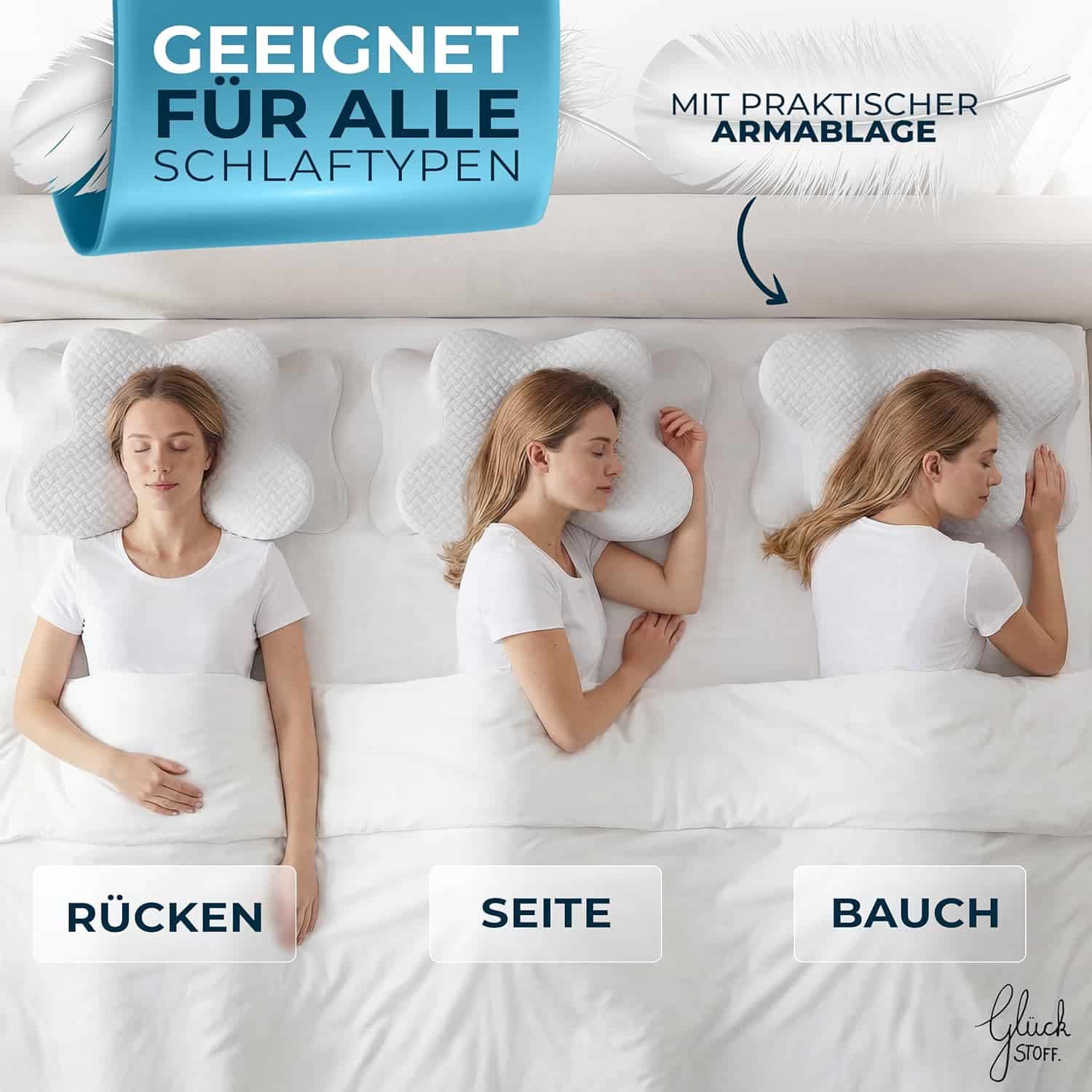 Das ergonomische Nackenstützkissen aus Memory Foam von Glückstoff sorgt für eine natürliche Schlafhaltung und entlastet gezielt Nacken und Wirbelsäule.